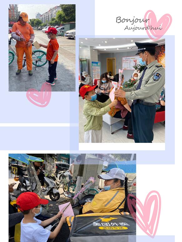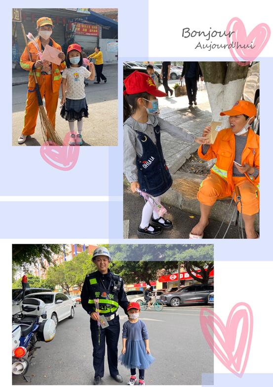 劳动是辛苦而光荣的,劳动是快乐而自豪的,感恩的种子在金幼蔓延,感恩从身边开始......金幼宝贝们带着鲜花和卡片走出幼儿园,走进社区,为环卫工人、超市售货员、警察叔叔送上了我们最真挚的敬意和祝福!“叔叔阿姨,你们辛苦了,劳动节快乐!”道出了孩子们的敬重之意。